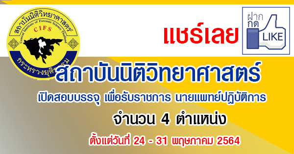 สถาบันนิติวิทยาศาสตร์ เปิดรับสมัครสอบเข้ารับราชการ จำนวน 5 อัตรา รับสมัครทางอินเทอร์เน็ต ตั้งแต่วันที่ 24-31 พฤษภาคม 2564