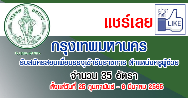 กรุงเทพมหานคร รับสมัครสอบเพื่อบรรจุเข้ารับราชการ ตำแหน่งครูผู้ช่วย 35 อัตรา รับสมัครทางอินเทอร์เน็ต ตั้งแต่วันที่ 25 กุมภาพันธ์ - 6 มีนาคม 2565